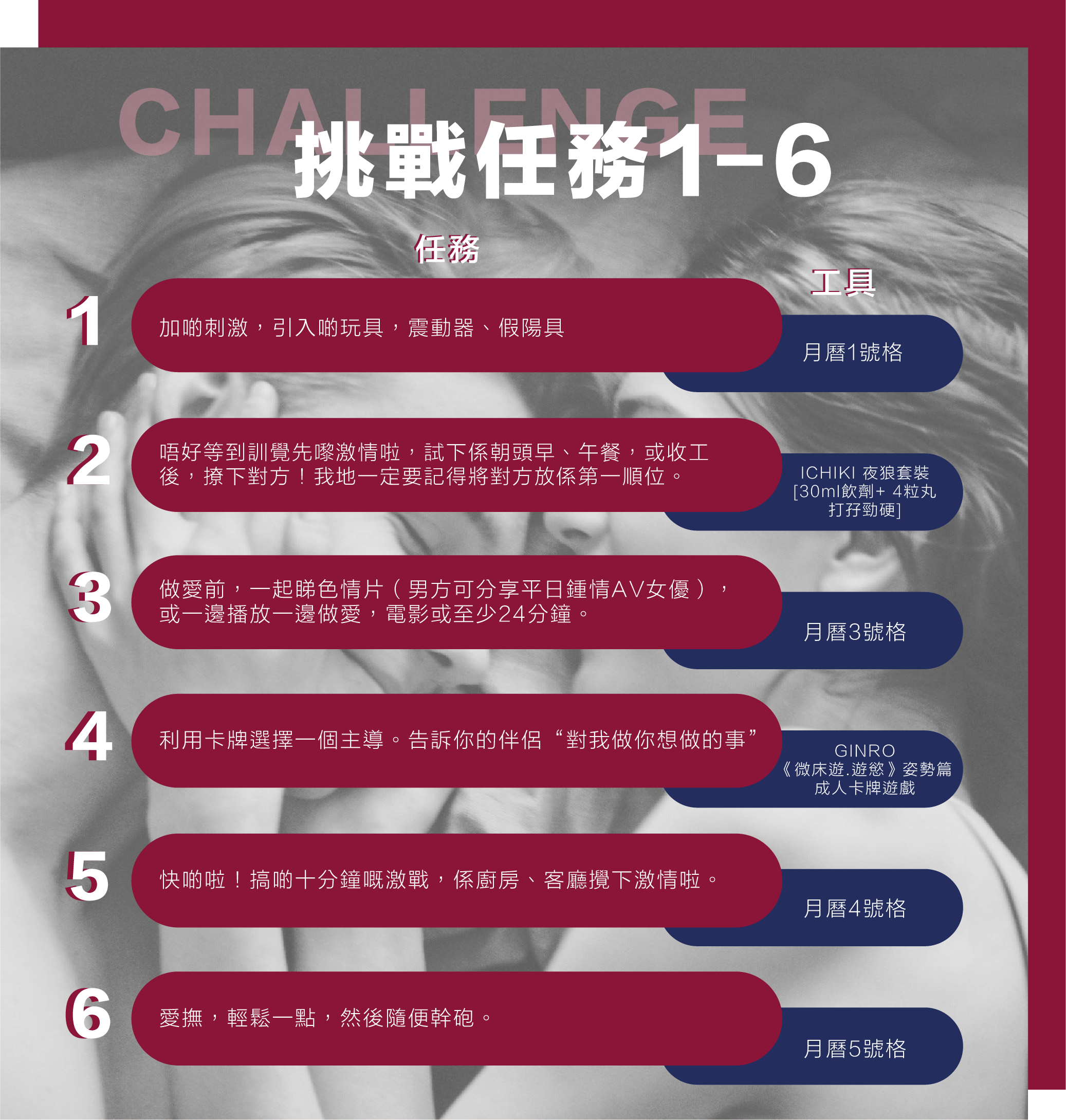 挑戰涵蓋各種互動,包括不同的性愛體驗、浪漫冒險和情趣提升。每天都有一個新的主題,確保整個挑戰充滿多樣性和驚喜。