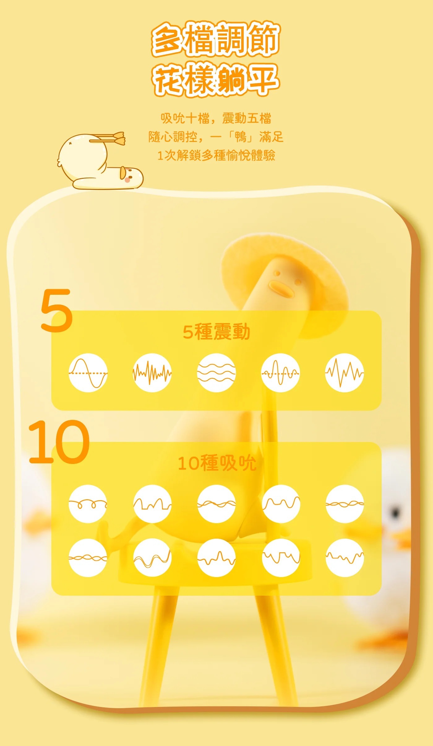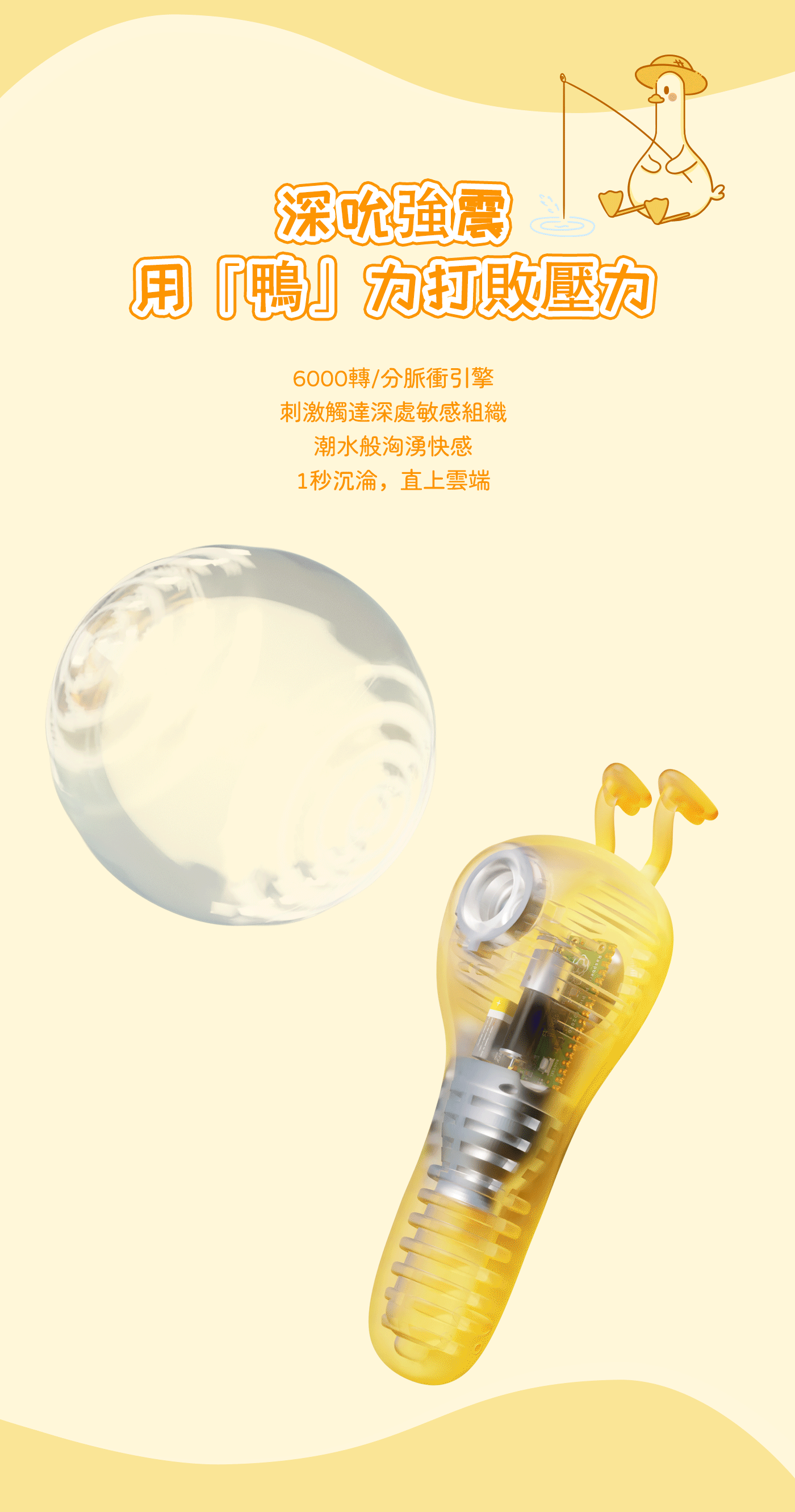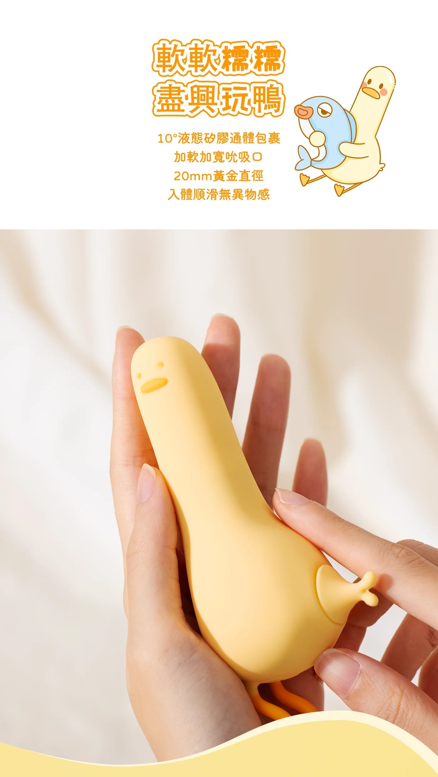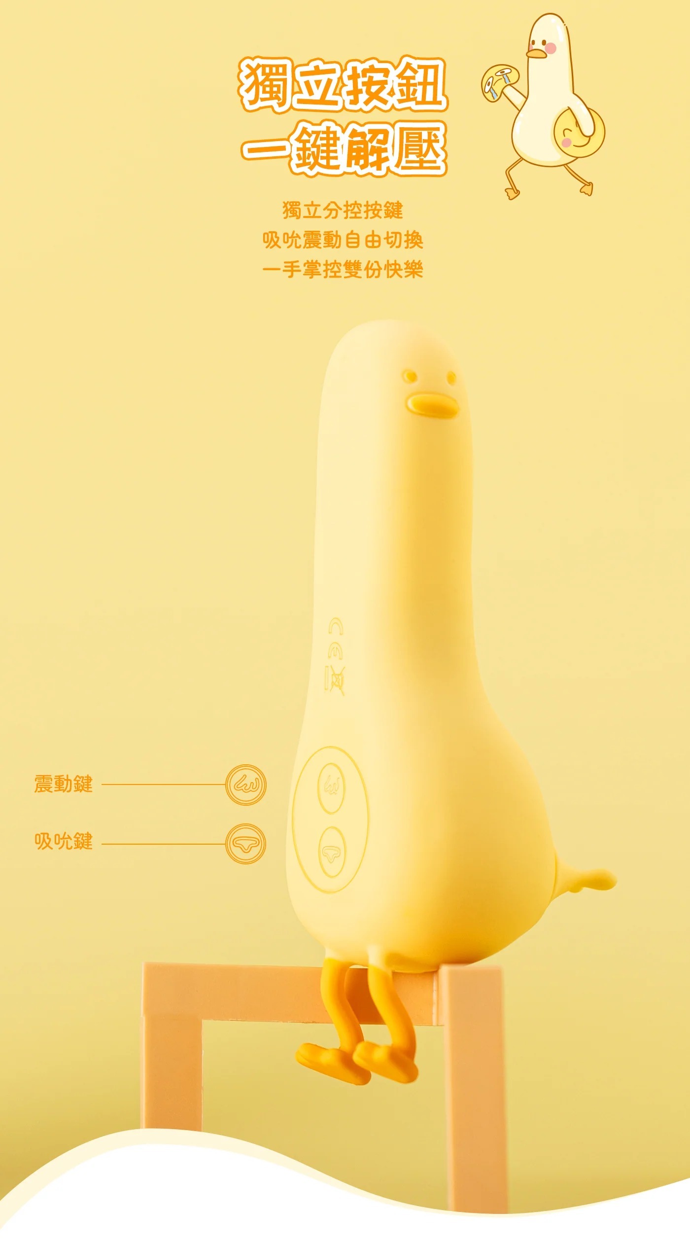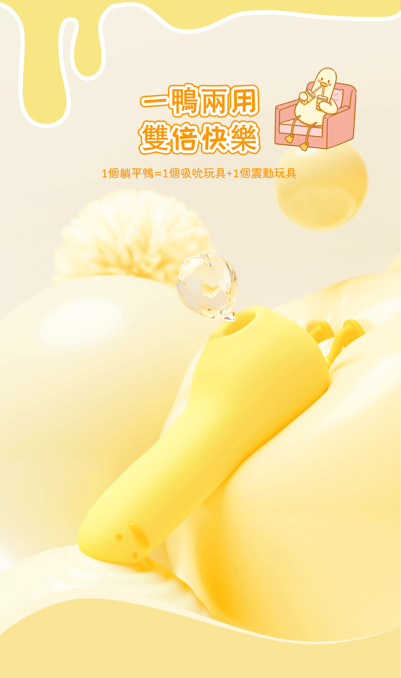 2023年全新上市「BeYourLover・躺平鴨」二合一非情趣化成人用品,結合吸吮和震動雙重功能,適合初學者。5種吸吮模式與10種震動模式,6000轉脈衝引擎深入刺激敏感區域。Q萌外觀小巧便攜,靜音設計低至45分貝,IPX6級防水,採用USB充電,隱密發貨並附一年保修。