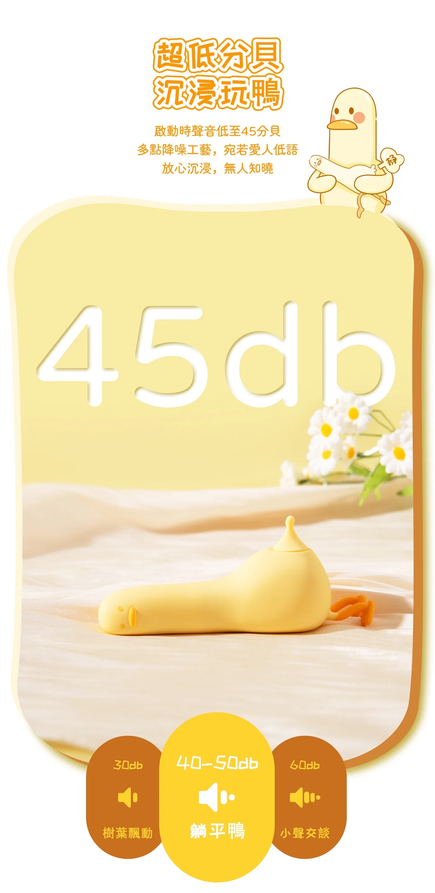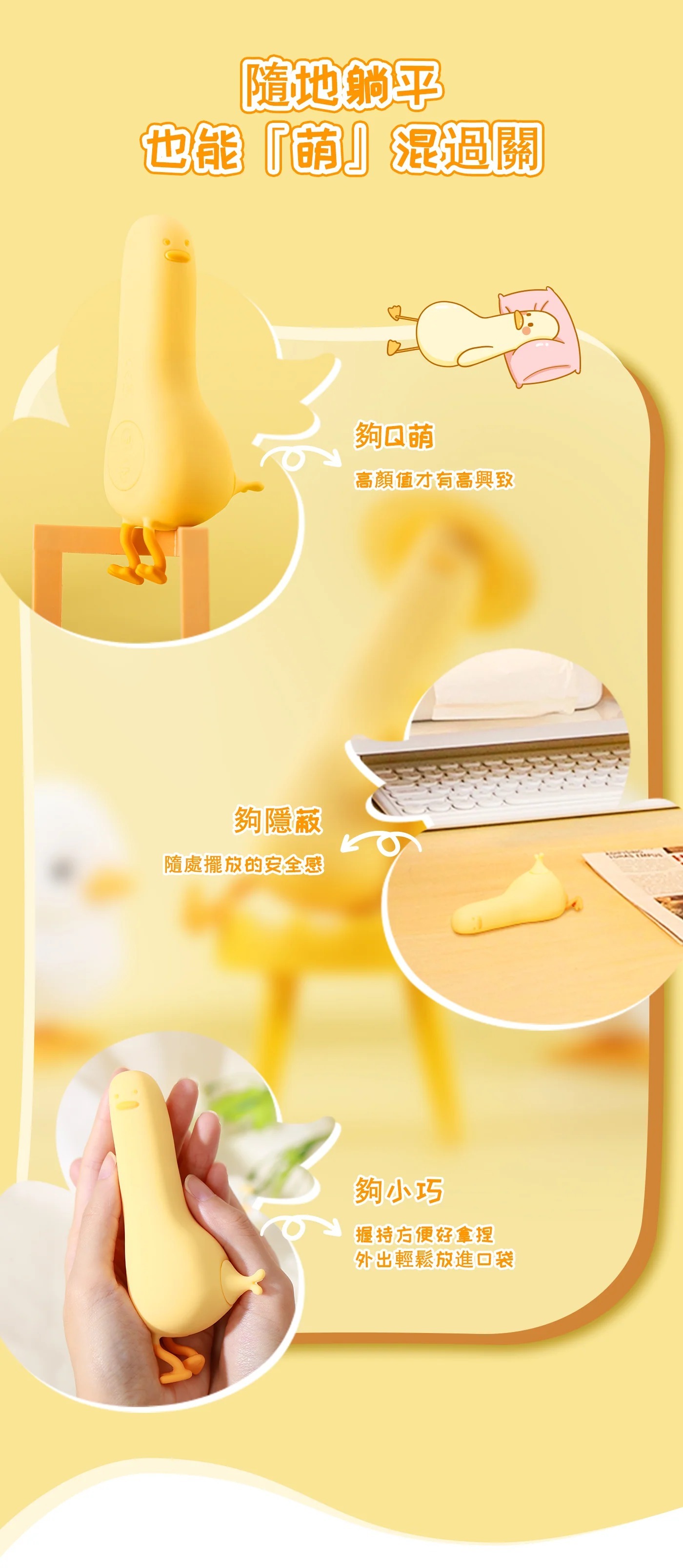 躺平鴨的外觀設計Q萌可愛,小巧便攜,放在任何地方都不易被察覺,完美兼顧隱私與實用性。它採用高級貼膚的柔軟矽膠材質,對皮膚溫和,特別適合敏感部位使用,確保每一次的體驗都舒適安全。