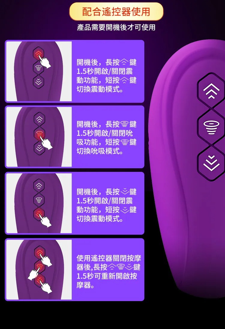 具有10種不同震動伸縮模式和簡易快速操作的無線遙控器。仿真入體刺激G點和吸啜舔震帶來的強力C點刺激,讓您樂而忘返,高潮不斷!