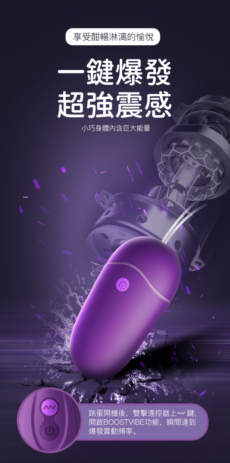 採用靜音設計和親膚柔軟的矽膠,末端有拉線方便操作。設有強勁,耐用的馬達;一共有12種智能震動模式和一鍵爆發的Boostvibe高潮模式可任意選擇。