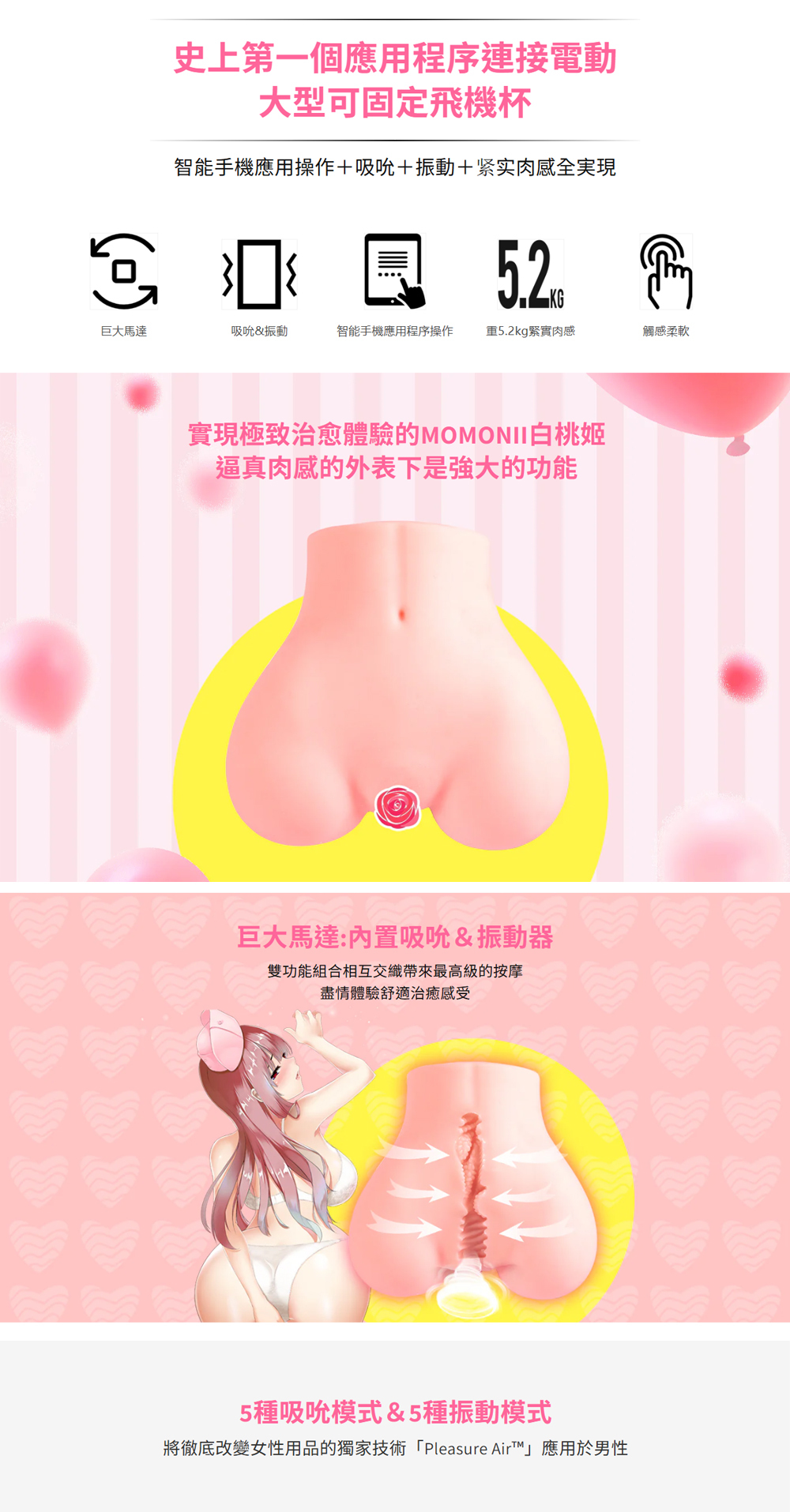 MOMONII推出史上最新的智能飛機杯系列【白桃姫】,具備吸吮+振動+緊實肉感,並支持APP遙控操作,讓您釋放雙手,享受前所未有的刺激快感!