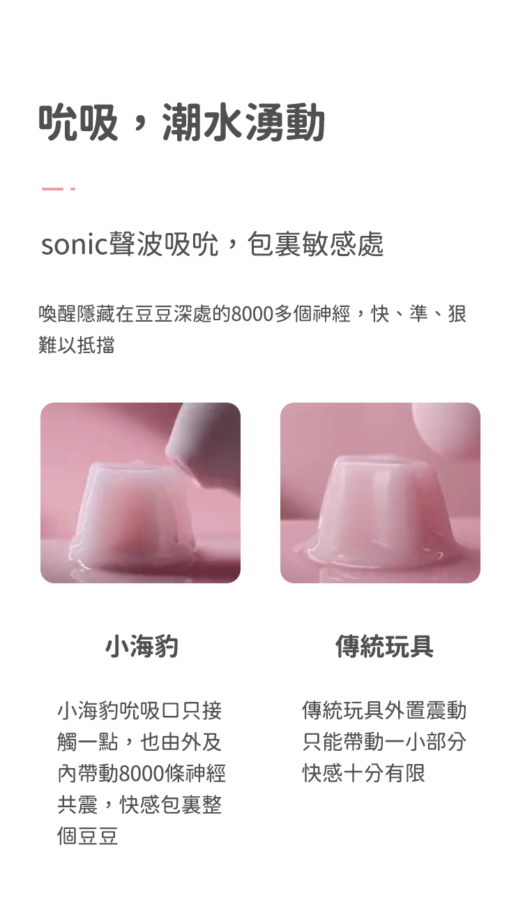 不僅能吮吸豆豆,頂觸G點,還能內外兼攻,連續高潮,一重過後,G點更敏感澎出,這時啟用頂震抽送直接或纏綿,即可開啟高潮新峰值。