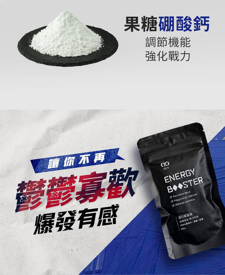 6倍濃縮黑馬卡:採用秘魯安地斯山黑馬卡萃取,搭配紅葡萄果汁粉,補充日常所需能量。它含有牛磺酸、鋅酵母、南非醉茄萃取、黃精萃取、鰹魚萃取、果糖硼酸鈣及支鏈胺基酸(BCAA),支持新陳代謝與活力。