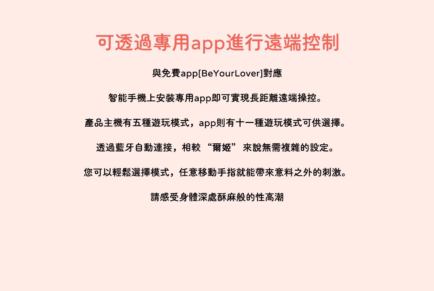 這款震動棒採用人體工學設計,符合身體曲線,能深入到敏感點,給你極致的愉悅感。透過【BeYourLover】應用程序進行遠程操控,與你的伴侶共享更豐富的玩法,即使相隔萬里也能心靈相通。高級貼膚的柔軟矽膠材質對皮膚溫和,即便敏感部位也能安心使用。