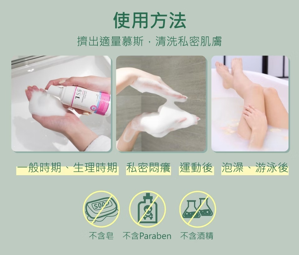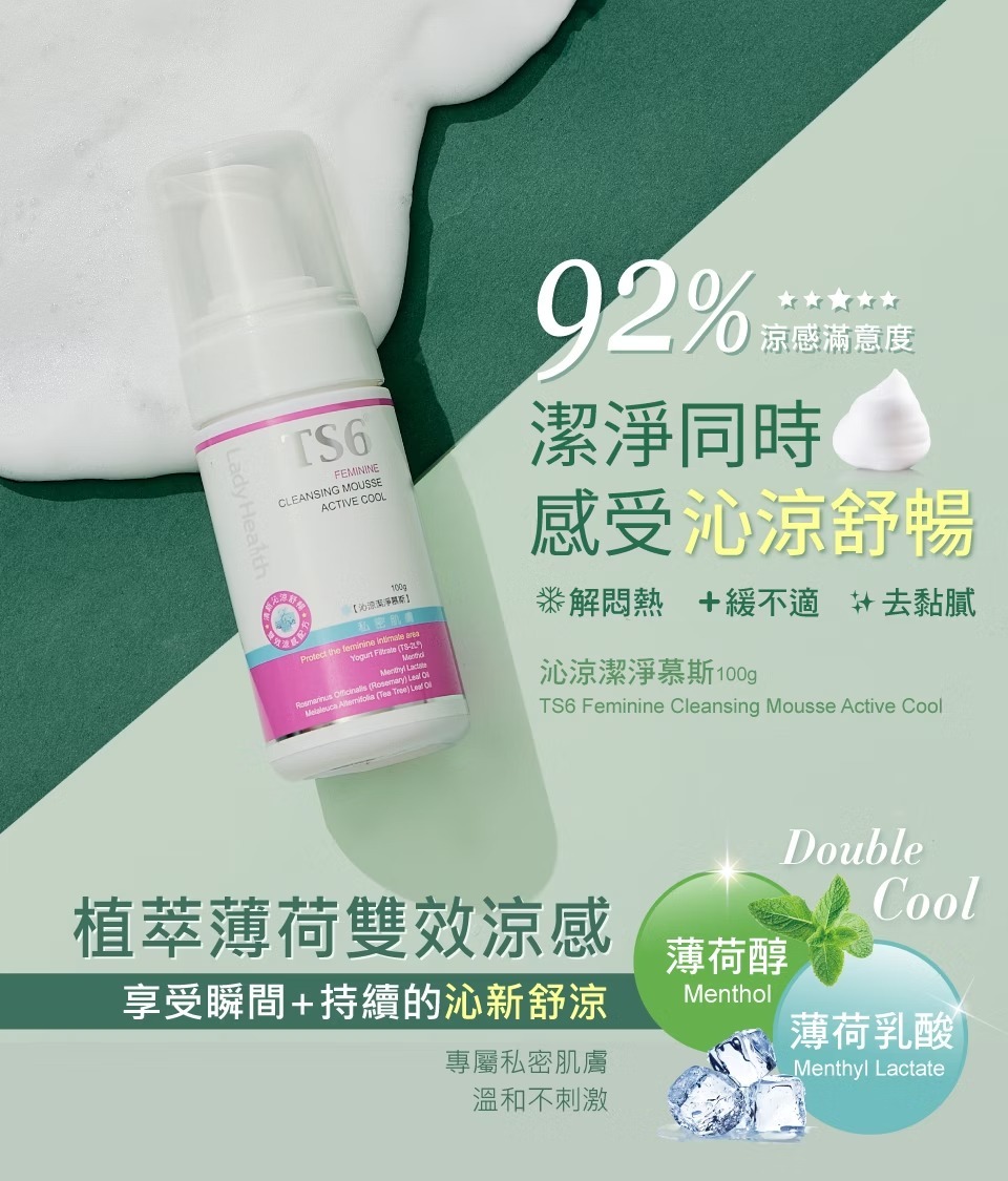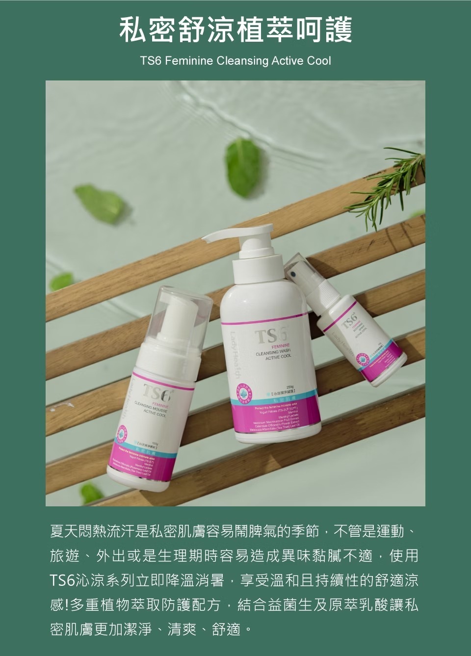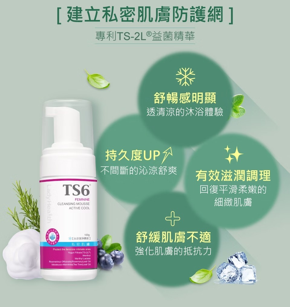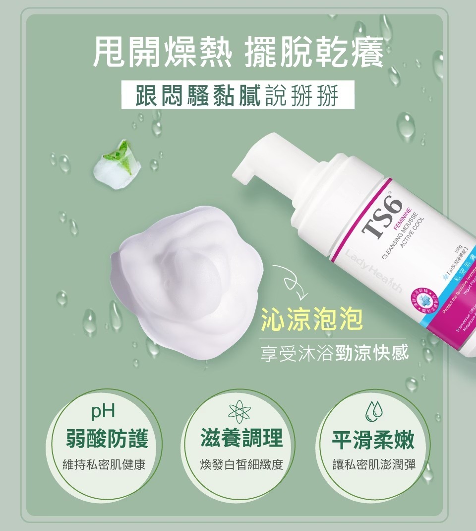 TS6潔淨慕斯專為女性清潔而弄研發,輕按擠出綿密豐盈泡沫,綿密泡泡能減少肌膚摩擦,溫和潔淨私密肌膚。潔淨慕斯含豐富牛奶發酵萃取活性成分TS-2L®,有助平衡私處pH值,締造健康好環境。特別添加茶樹精油及天然蘆薈萃取物,能舒緩私密肌膚乾燥不適,含氨基酸、有機酸、多醣等豐富的保濕因子,為私密肌膚持續注滿水分,延緩肌膚衰老。更有迷人櫻花香味,同時為私處淨味,帶來全日如沐浴後的潔淨清爽新體驗。