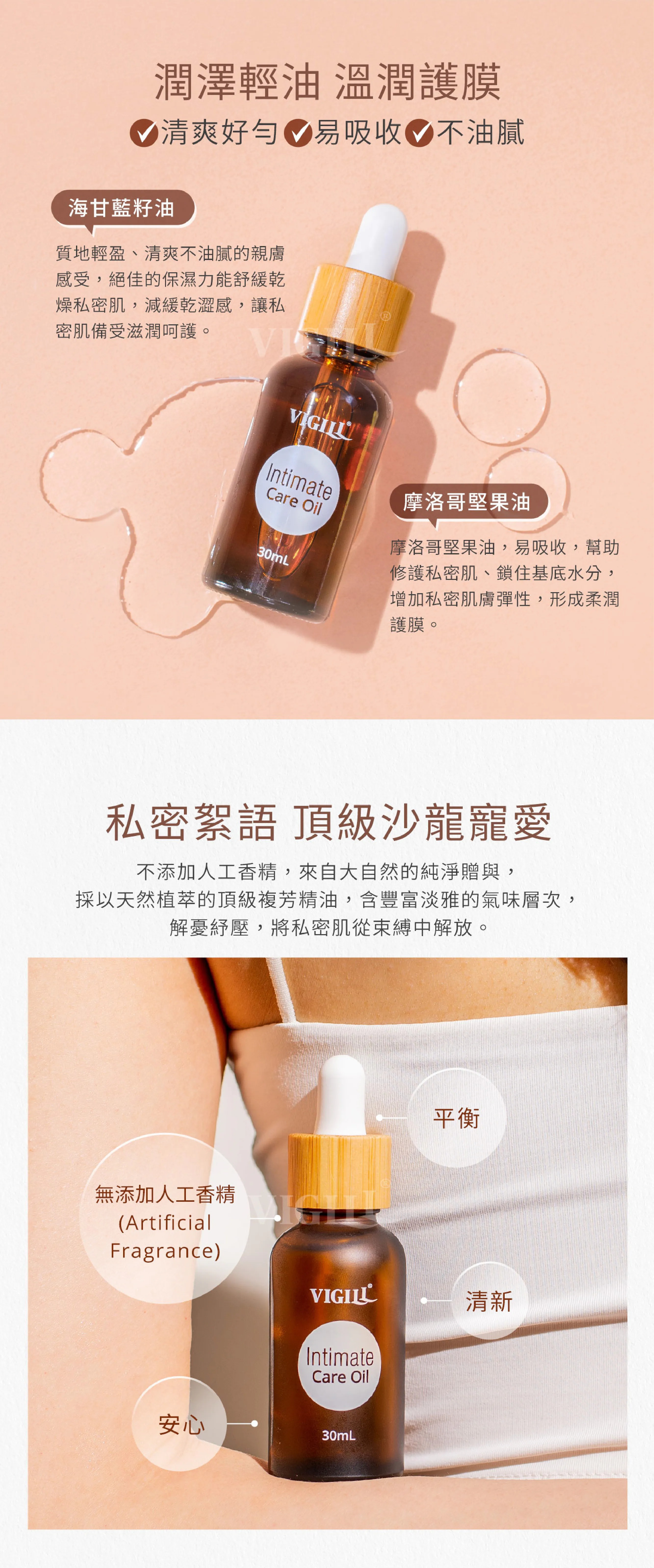 多功能私密肌膚護理油,結合天然精油與植物成分,滋潤、修護與舒緩私密肌,帶來無香精的自然女性魅力。