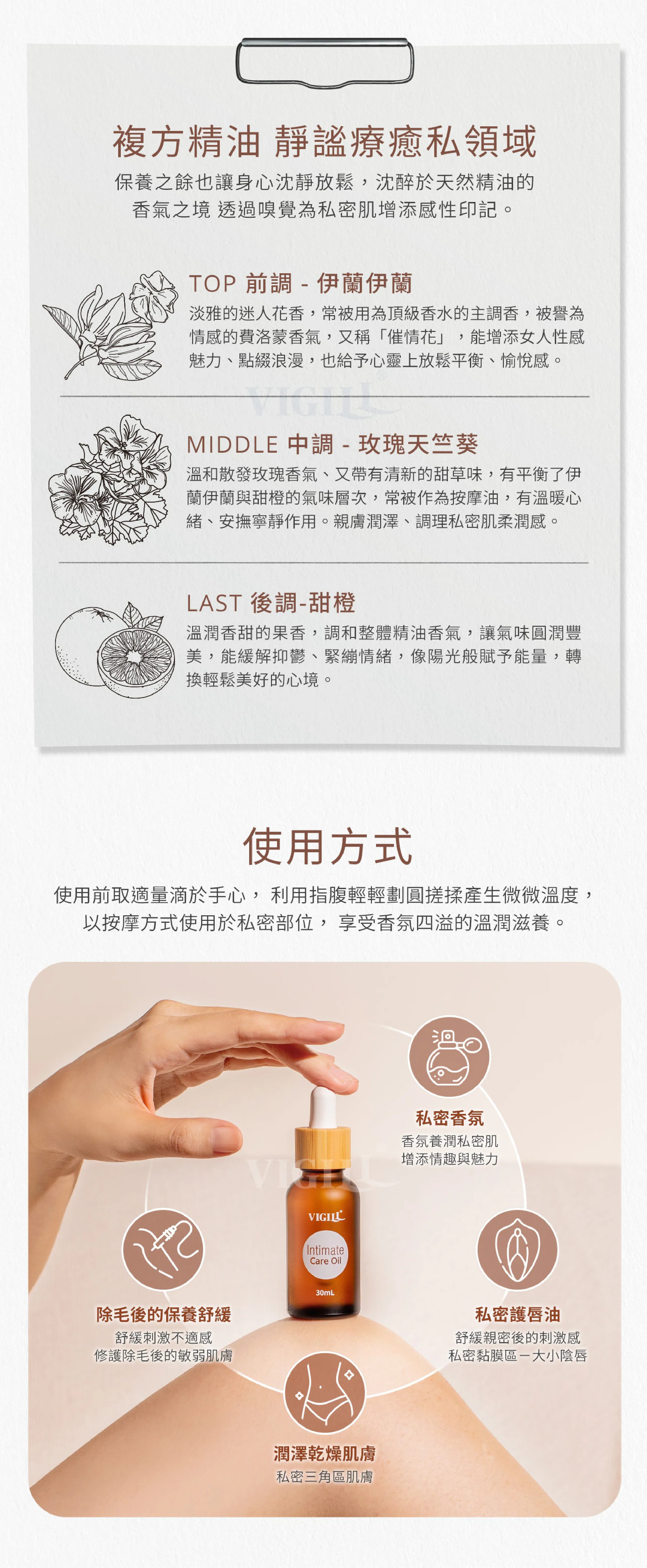 為女性量身打造的香氛精油護理油,讓您在每日護理中感受溫柔呵護。無論是除毛後的敏感期、自愛時的舒緩需求,或是親密後的肌膚修復,這款護理油均能有效提供潤澤、修護與舒緩,讓私密肌膚保持水潤與彈性。
