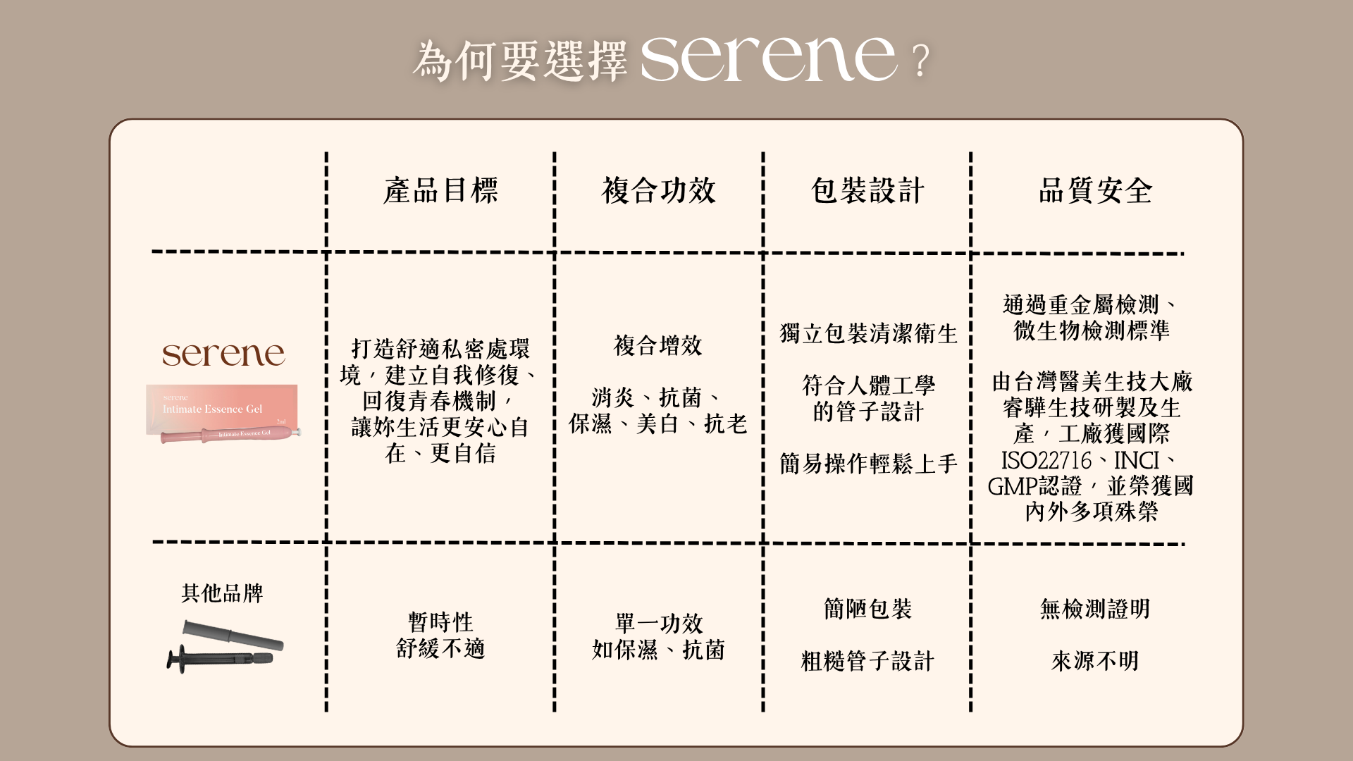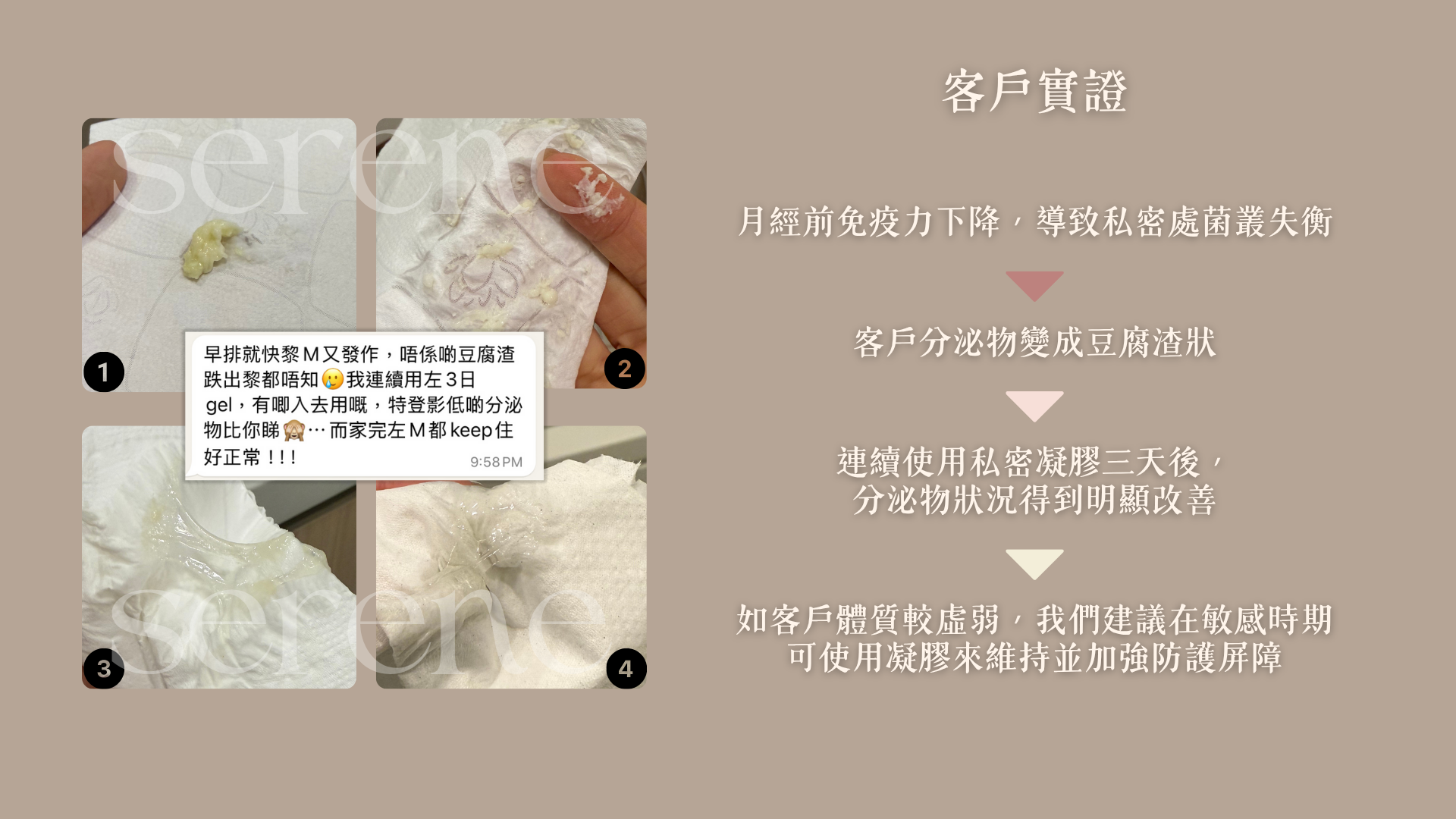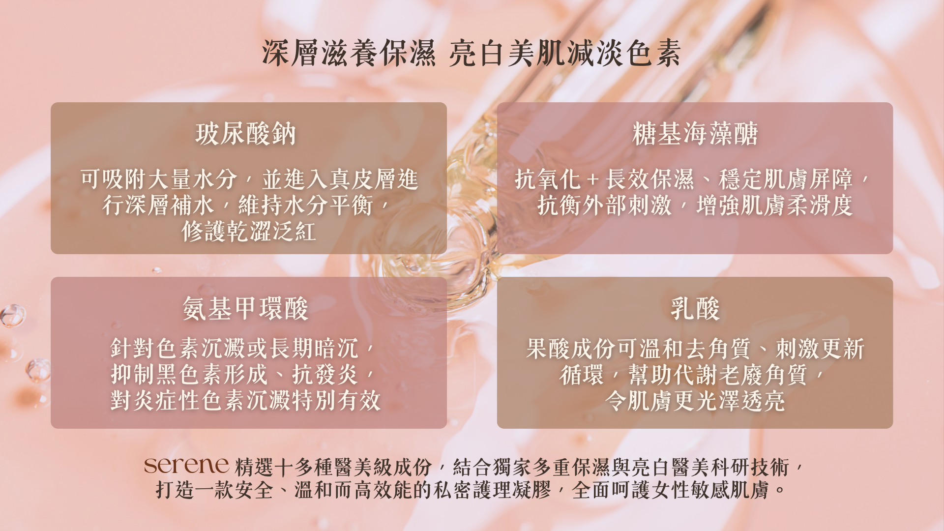 SERENE 全效私密呵護凝膠以溫和配方研製,蘊含植物萃取與保濕成分,能即時補充水分,舒緩乾燥並維持健康平衡,讓妳重拾自在清爽。
