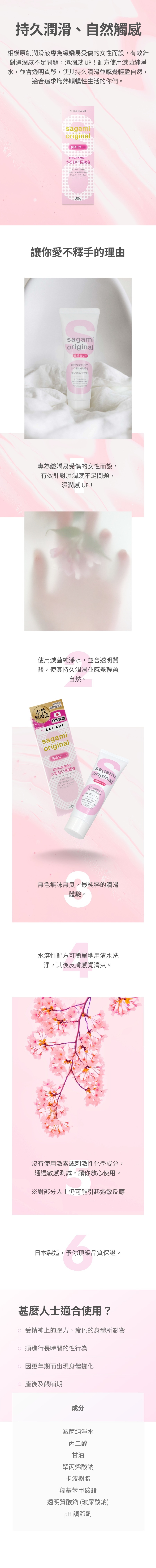 適合18歲以上成年人士,特別是因陰道乾澀、壓力或生理期影響分泌的女性,以及希望提升親密舒適度與快感的情侶。Sagami 相模原創潤滑凝膠適合搭配安全套(如Sagami 原創 0.01/0.02)或情趣玩具使用,為浪漫約會或日常親密增添順滑體驗。