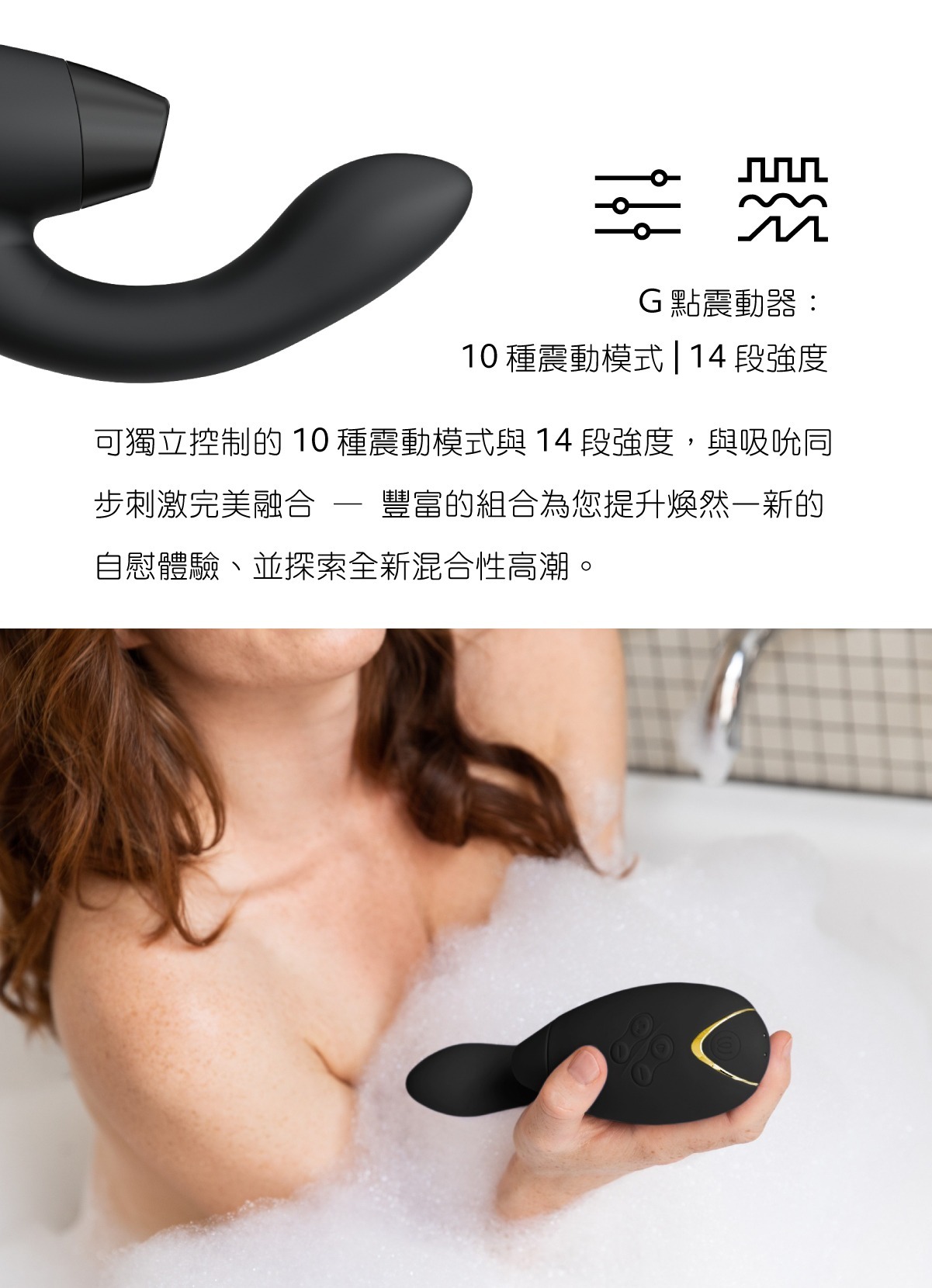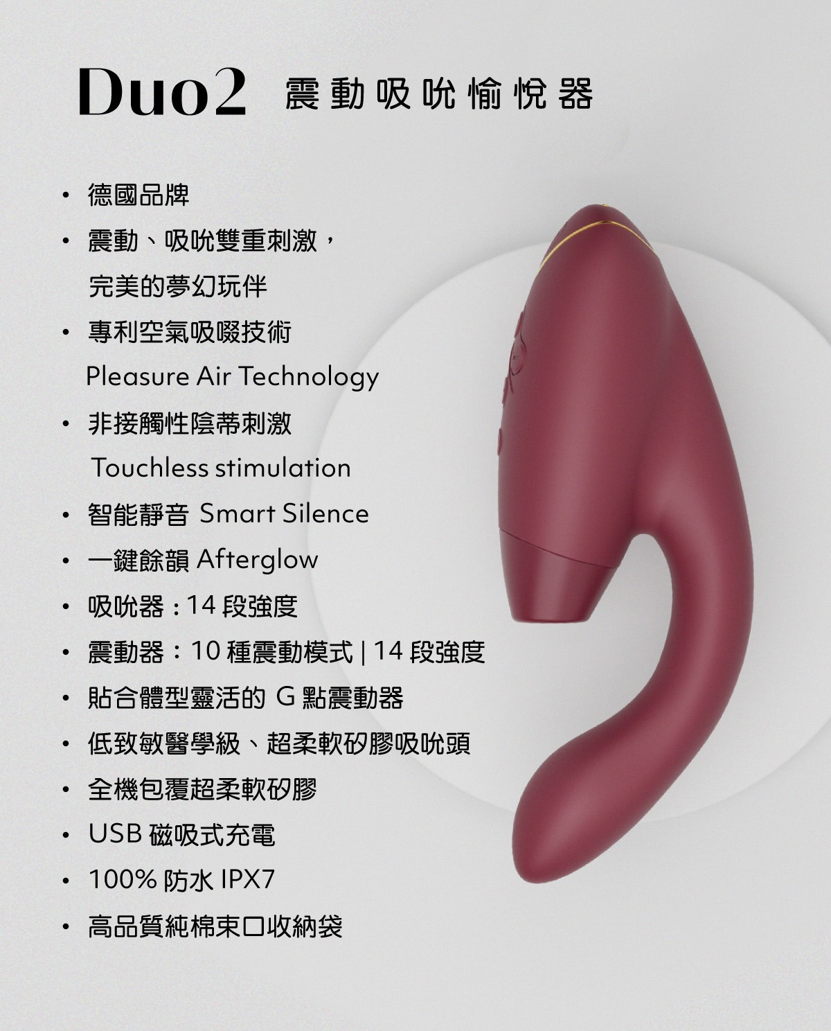 DUO 2 是一款獨特的優質玩具,結合了 Pleasure Air 技術的陰蒂刺激器和強大的 G 點振動器,可創造出高級的混合性高潮。