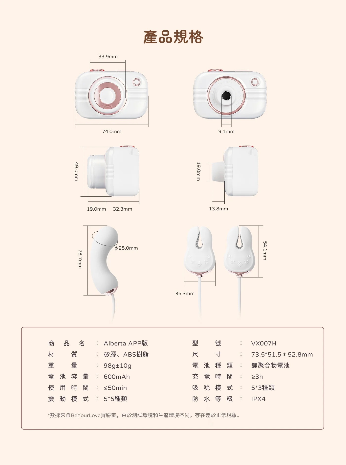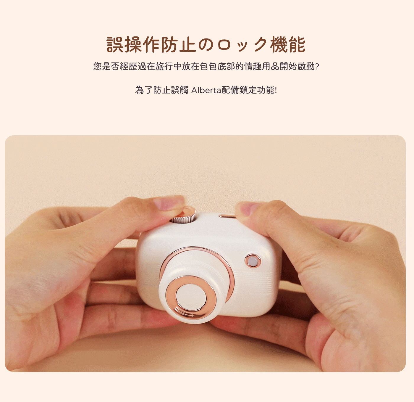 設計上,Alberta以如珍珠般白皙亮澤的外觀搭配玫瑰金色金屬配件,散發著高貴氣質。外形就像一台普通的相機玩具,隱密性極高,無論是自己使用還是與伴侶共享,都能輕鬆享受不被察覺的刺激時光。