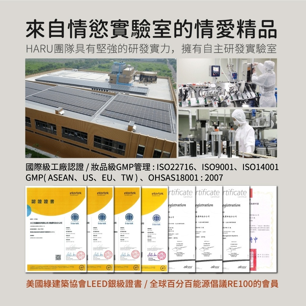 台灣GMP製造:由大江生醫美膚科技分公司生產,符合ISO22716、ISO9001、ISO14001及GMP認證,已投保新台幣1000萬元產品責任險,品質卓越。