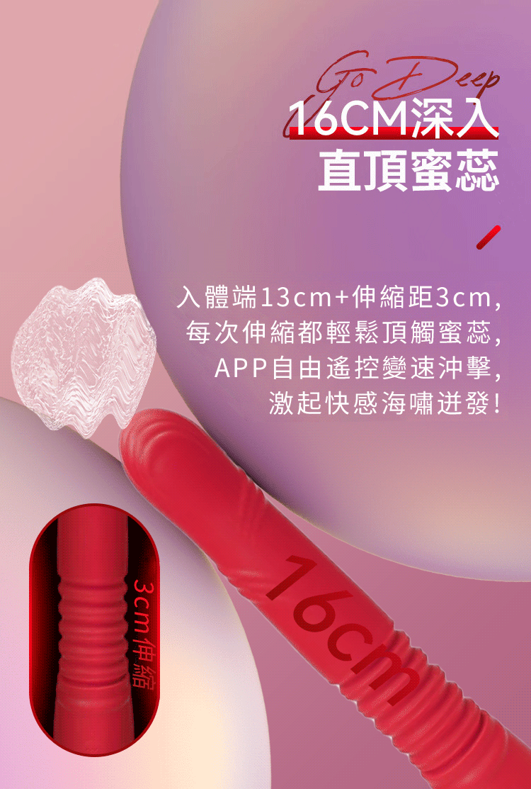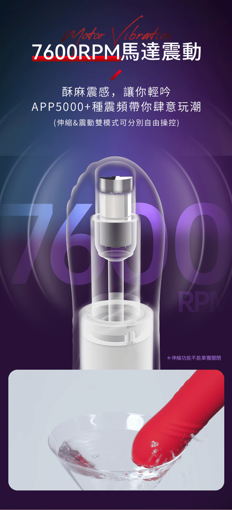 位於頂端的震動馬達&伸縮頻率140次/分鐘,伸縮行程3厘米(1.18英寸)。