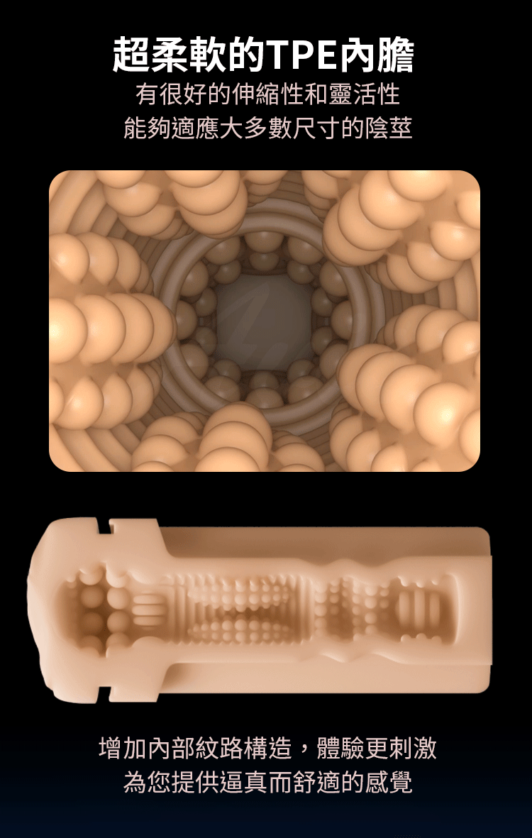 Solace Pro 具備為超柔軟的TPE內膽,Solace Pro 具有很好的伸縮性和靈活性,能夠適應大多數尺寸的陰莖。內部紋路為您提供逼真而舒適的感覺,讓您獲得更愉悅和滿足的體驗。內膽具備可拆卸的功能使清潔更加方便,無需清潔整個性玩具。