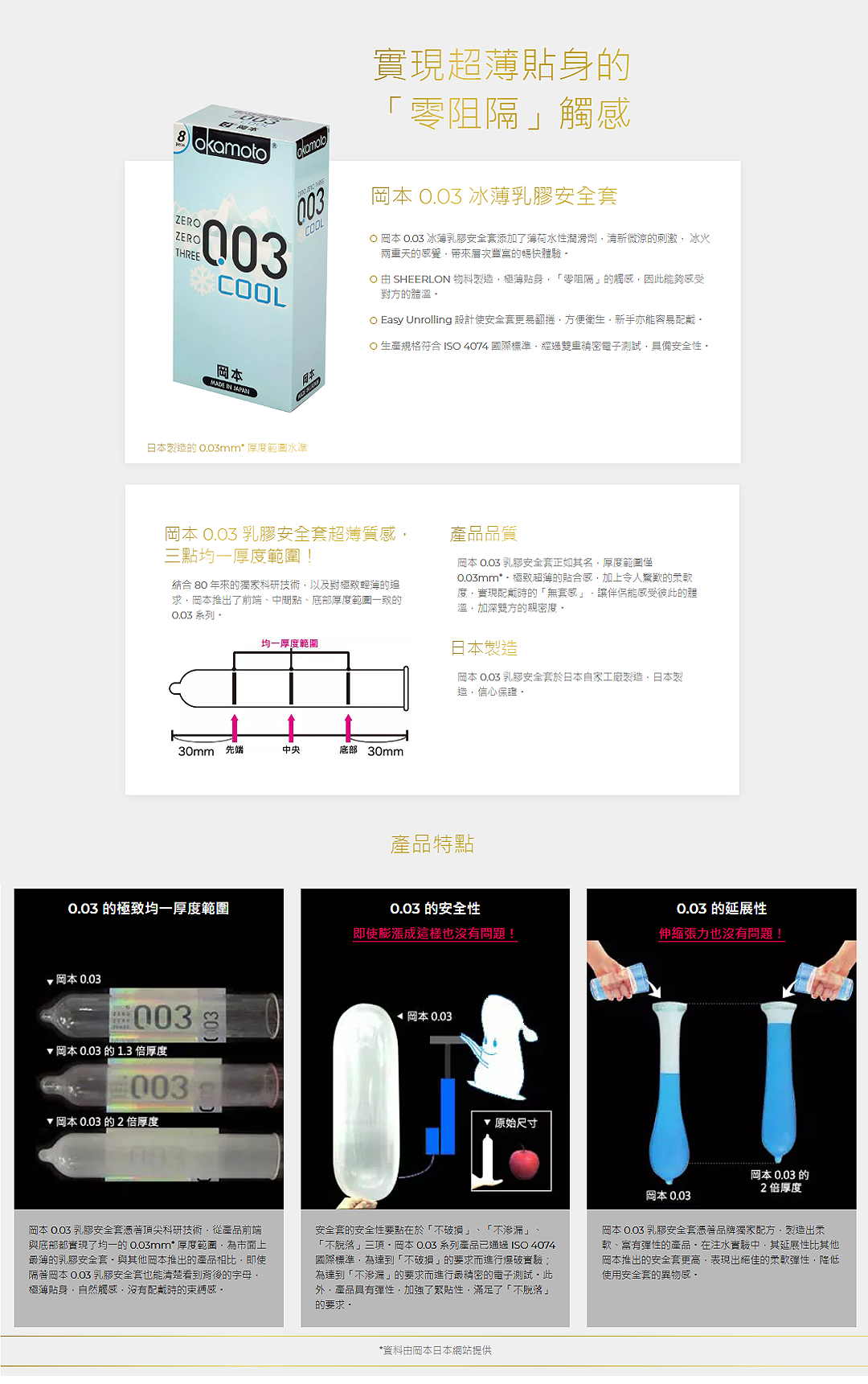 岡本 0.03 冰薄乳膠安全套添加了薄荷水性潤滑劑,清新微涼的刺激, 冰火兩重天的感覺,帶來層次豐富的暢快體驗。