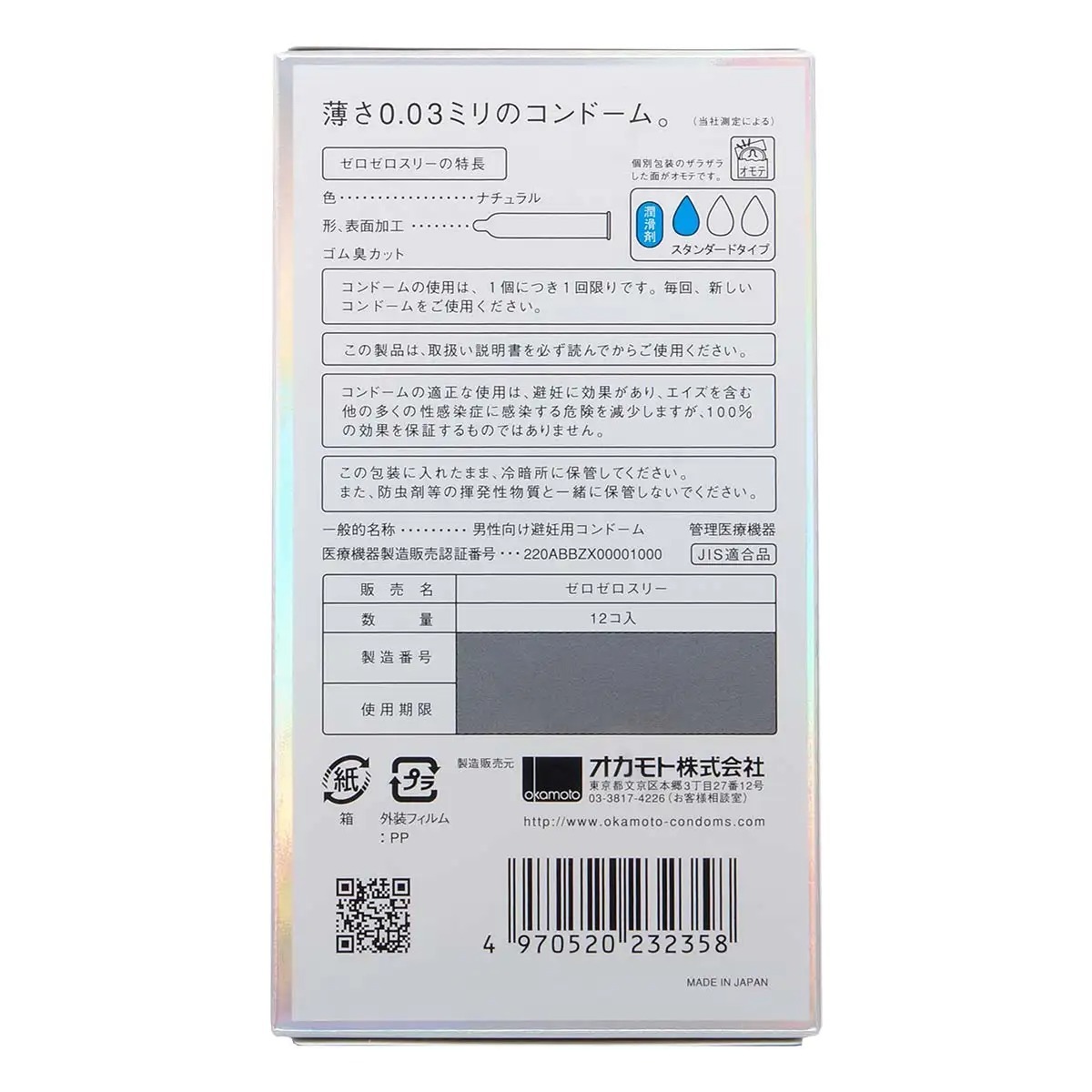 岡本。零零三是市面上其中一款最薄的安全套。岡本一直致力研究製作超薄且符合安全要求的安全套。而岡本。零零三亦體現了超薄安全套在製作工藝上的一大進步。