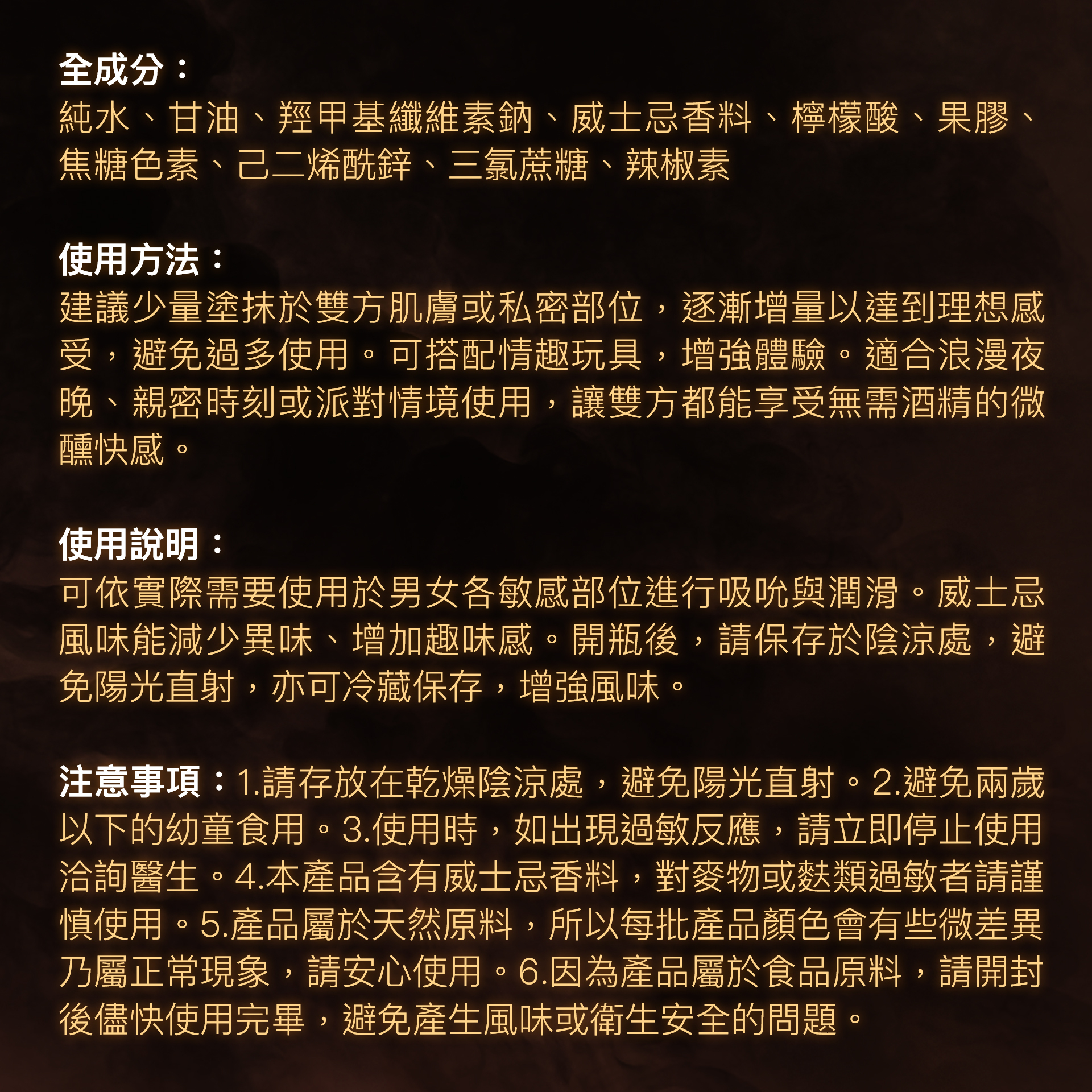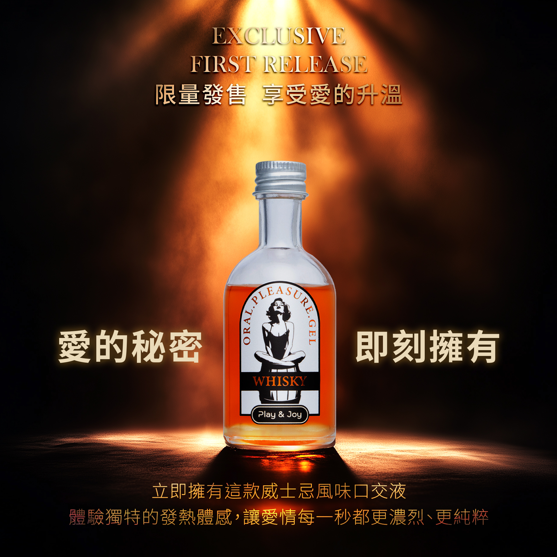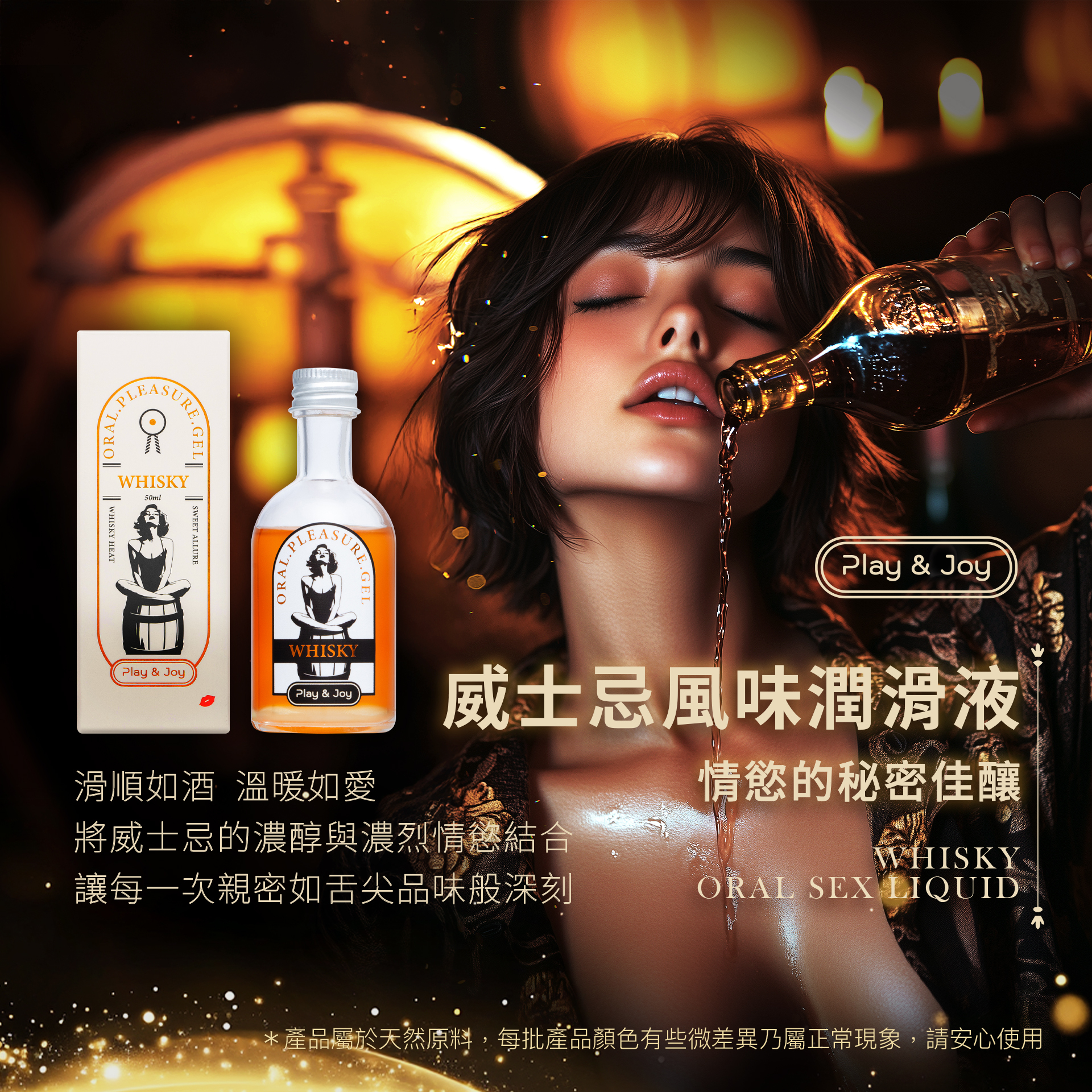 Play & Joy 威士忌風味口交液是一款結合獨特威士忌風味與天然暖感因子的可食用潤滑液,專為提升親密時刻設計。其食品級安全配方經 ISO 和 HACCP 認證,純素、水溶性、不黏膩,適合口交、陰道及肛門使用,並與安全套兼容。威士忌風味香醇辛香,無酒精成分,冷藏後使用更添清涼與愉悅感,讓每次親密體驗更為難忘。
