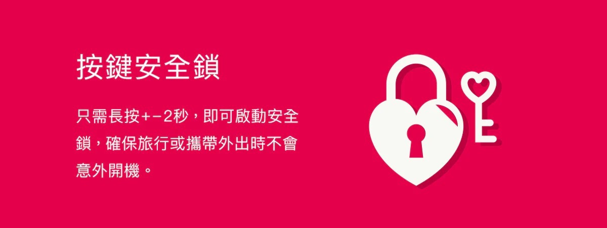 同時按下 + 及 - 按鈕兩秒,便會鎖定玩具按鈕,再也不必擔心玩具會不慎開啟的尷尬情況,分外貼心。