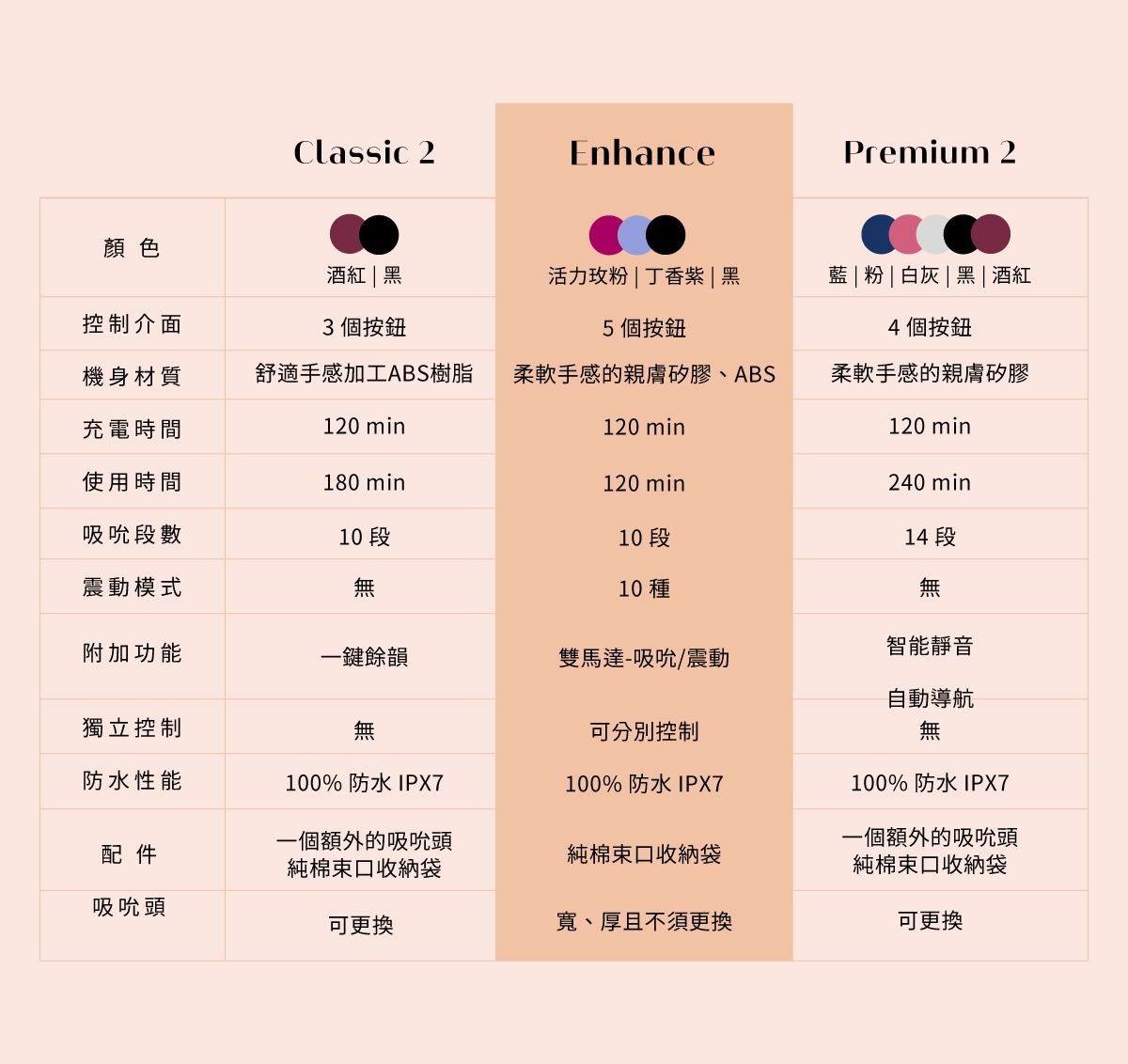 Womanizer Enhance 智能按摩器是一款結合德國專利Pleasure Air™技術與We-Vibe深層震動的創新按摩器,專為女性設計,提供舒適與多樣化的放鬆體驗。產品採用人體工學設計與柔軟親膚材質,搭載雙馬達獨立控制系統,可單獨或同時啟用氣壓與震動功能,創造超過1000種模式組合。其時尚外型與靜音設計,適合追求高品質與隱私的使用者。