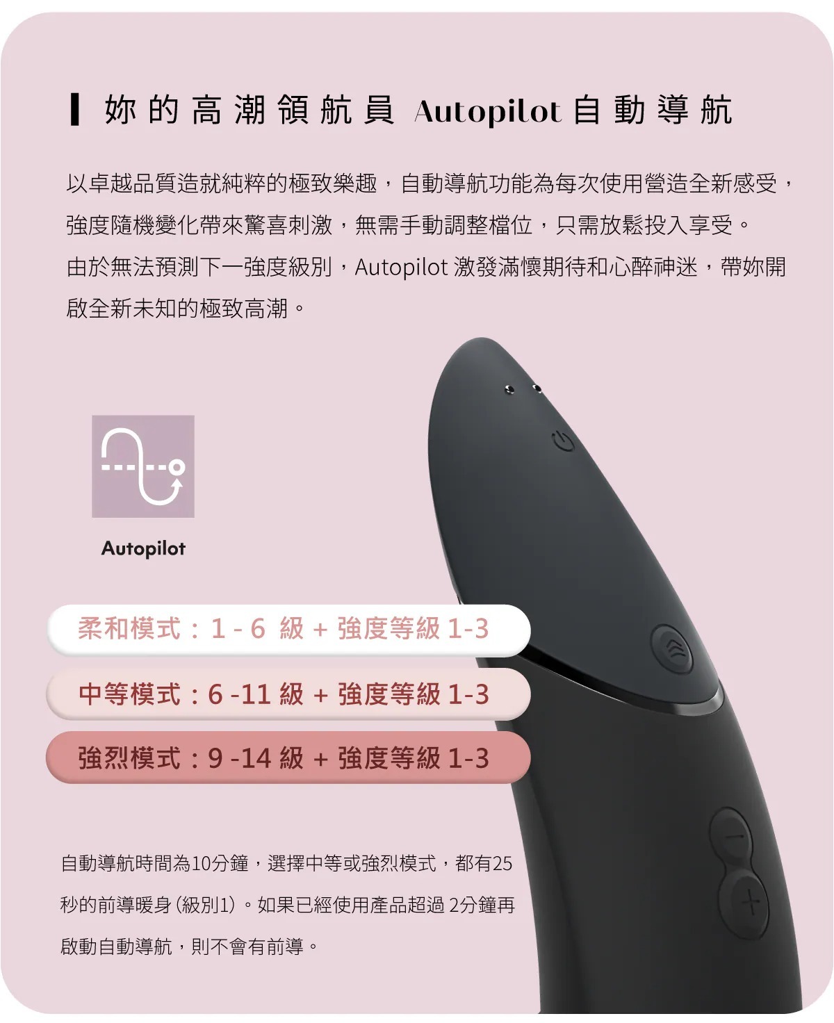 Autopilot 功能: 透過選擇預設的強度程序,讓 Next 引導您的快感之旅。餘下時間,您只須躺下盡情享受令人興奮的預設愉悅路徑,無需操作任何按鍵!