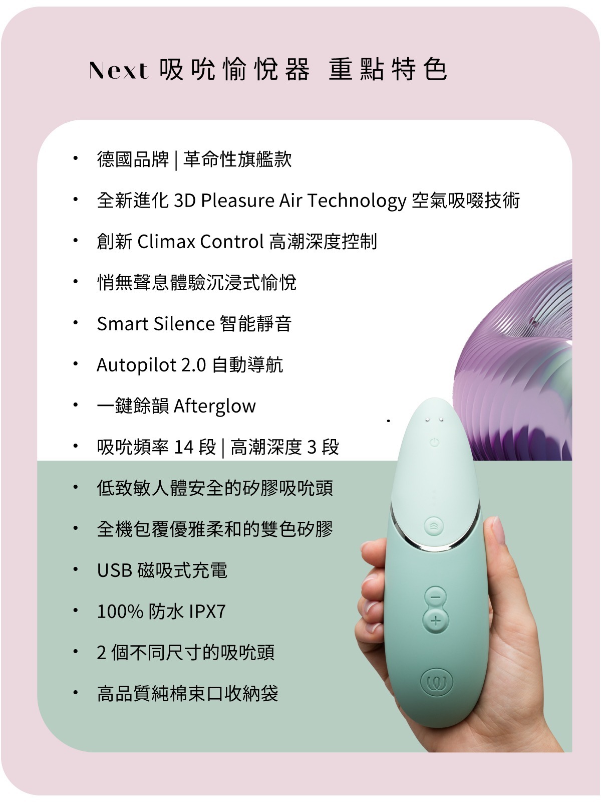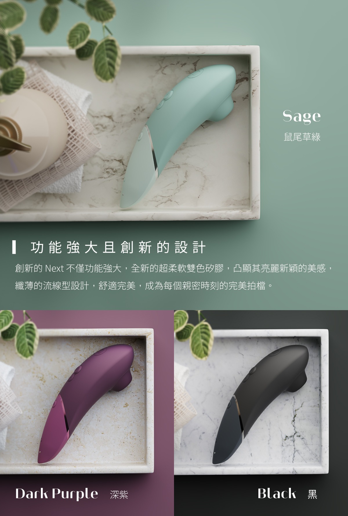擁有強大摩打的 NEXT 是 Womanizer 全新高端旗艦產品,透過嶄新功能與全新 3D Pleasure AirTechnology 提供奢華愉悅體驗及比以往更多的定製刺激,為用家帶來全新的愉悅體