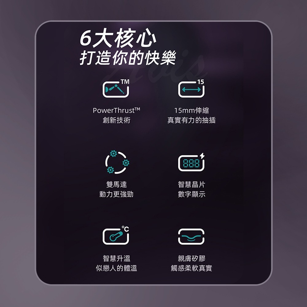 MOSE 的軸可實現靜音操作,最長可延長 15 毫米,每秒可提供高達 8 次推力,以實現強烈的內部刺激。軸的尖端通過精心放置的電機瞄準 G 點,提供直接振動。 MOSE 通過外部電機提供強烈的陰蒂刺激,該電機具有柔軟的矽膠襯墊層,可通過強大的振動舒適地按摩陰蒂。 MOSE 多種令人興奮的功能相結合,激發全身混合性高潮。 MOSE 還具有預熱功能,當您將其加熱至舒緩的溫暖狀態時,可增強其逼真的感覺。 MOSE 底座的顯示屏可以輕鬆監控功能和強度。
