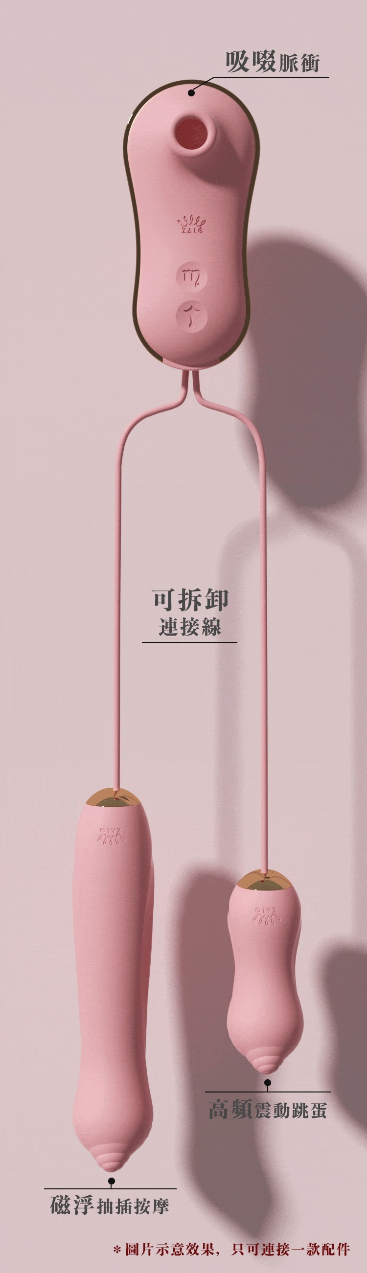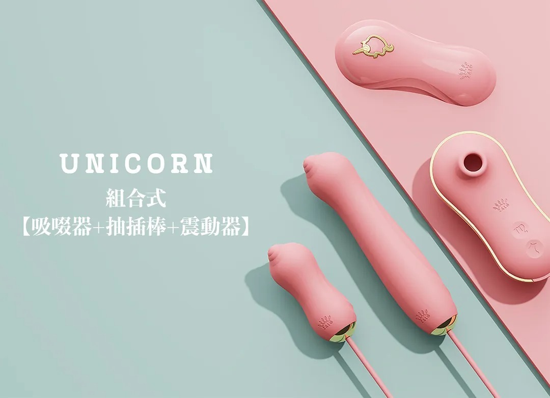 Unicorn Set 為創新的組合式震動器套裝, 主體是強勁的吸啜器, 附件有一個震蛋、一個抽插式按摩棒, 主體與附件可配搭使用。 自用時可同時按摩G點及C點, 更易達至雙重高潮! 情人間亦能一人一個,共震共享快感! 一物三用的高性價比美美玩具!
